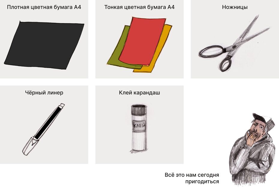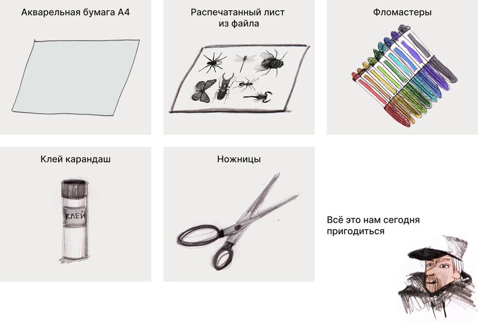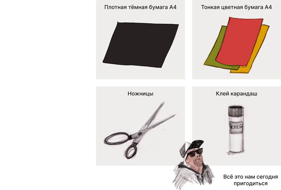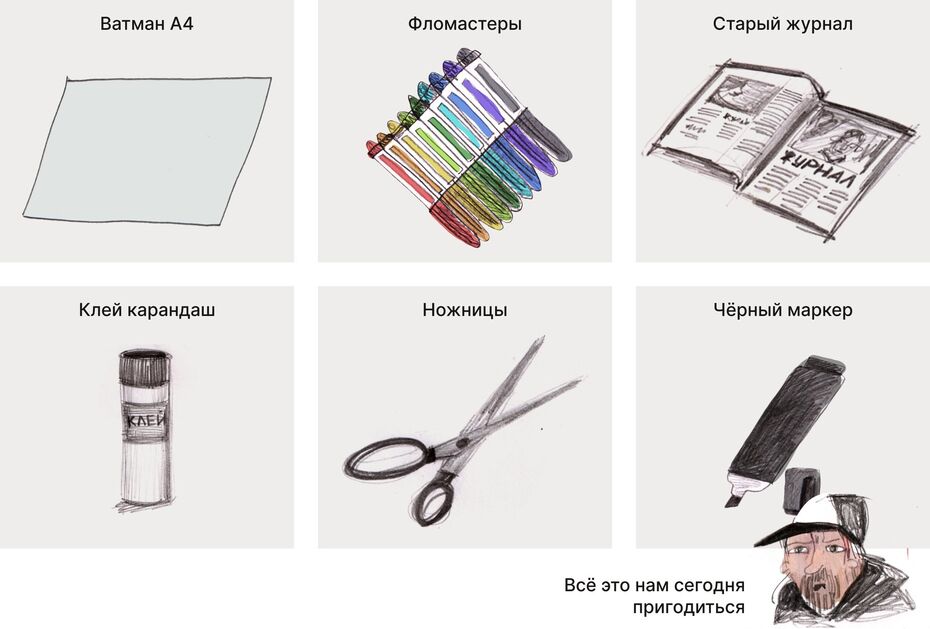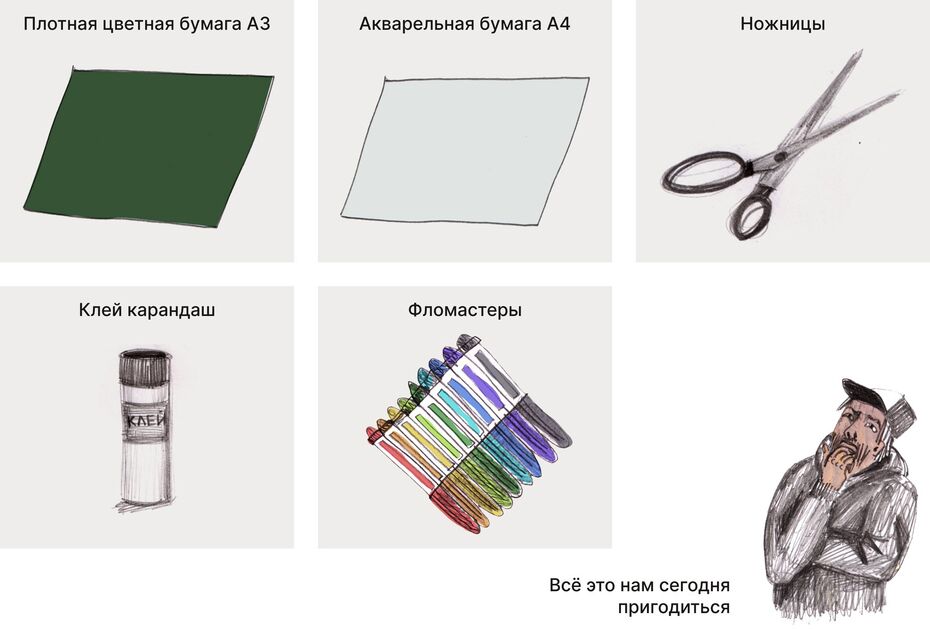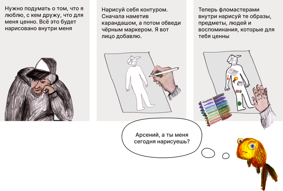 Давайте внимательно подумаем, что нас наполняет: какие мысли, эмоции, воспоминания или желания живут внутри. О чём они? Нарисуем себя, а внутри заполним рисунок картинками — изображением всего, что пришло в голову.