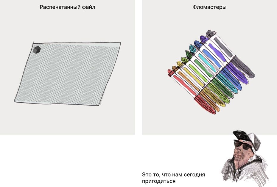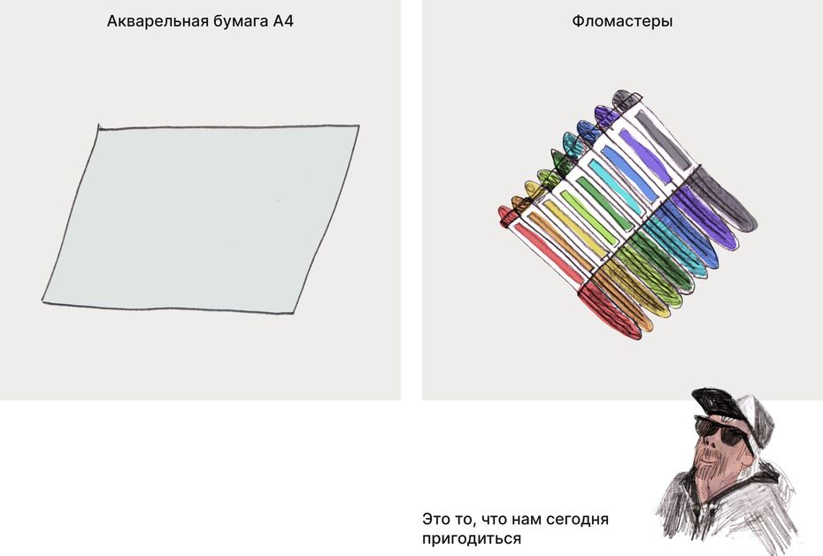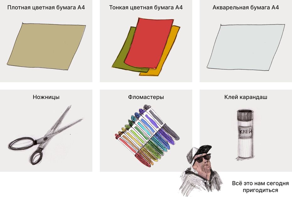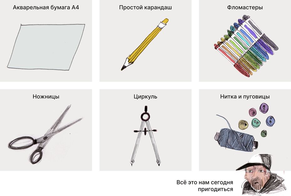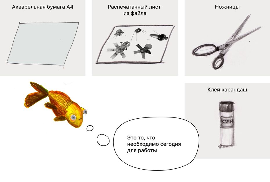 В обычном скотче можно узнать колесо и эта ассоциация поможет создать транспорт. А наушники могут ассоциироваться с носом обезьяны. Малярная кисть юбку. Деления на линейке, похожи на клавиши. А маркер неонового цвета почти светится на белом листе бумаги и ассоциируется с лазерным мечом. Даже скомканный лист бумаги, может показаться цветком.