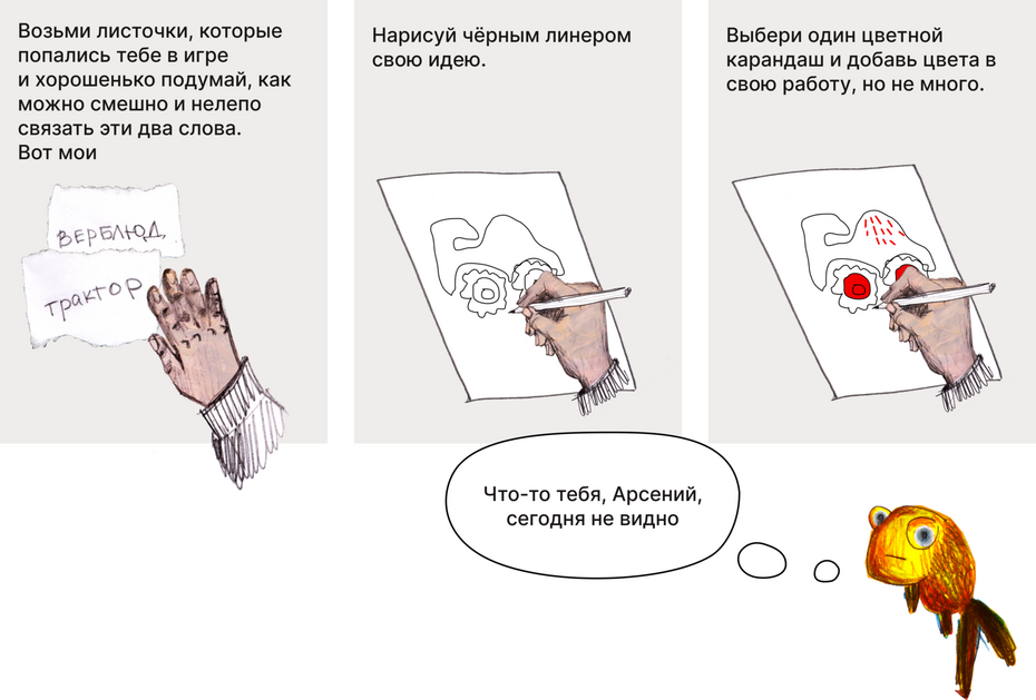 Возьми слова, которые тебе попались на уроке, подумай, что в них общего и соедини их в одну абсурдную графику.