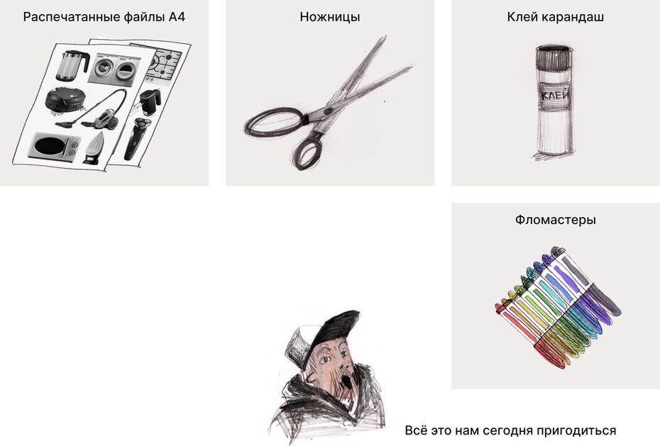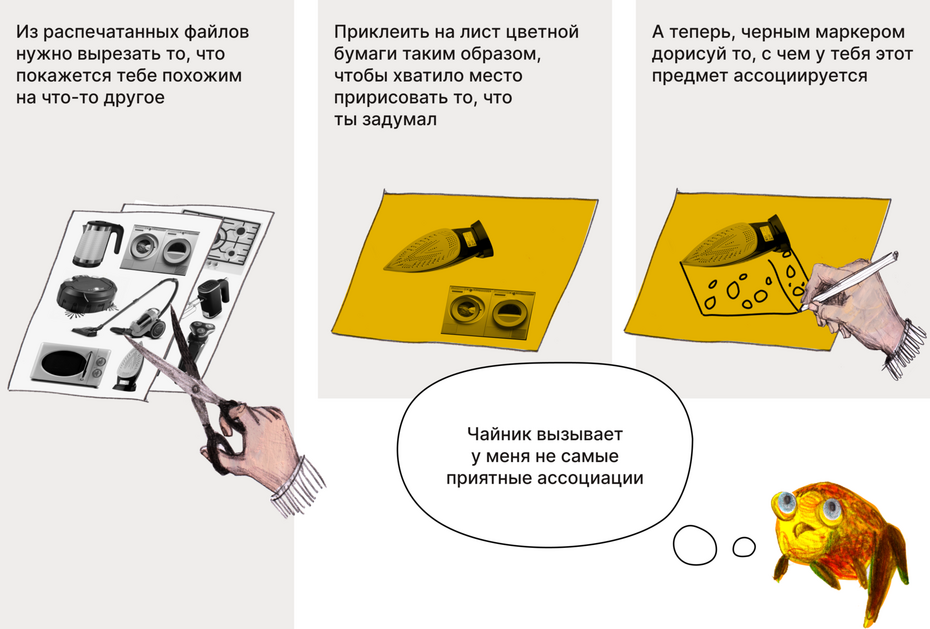 Глядя на распечатанный файл с бытовой техникой придумать с чем она у вас ассоциируется и дорисовать новый образ.