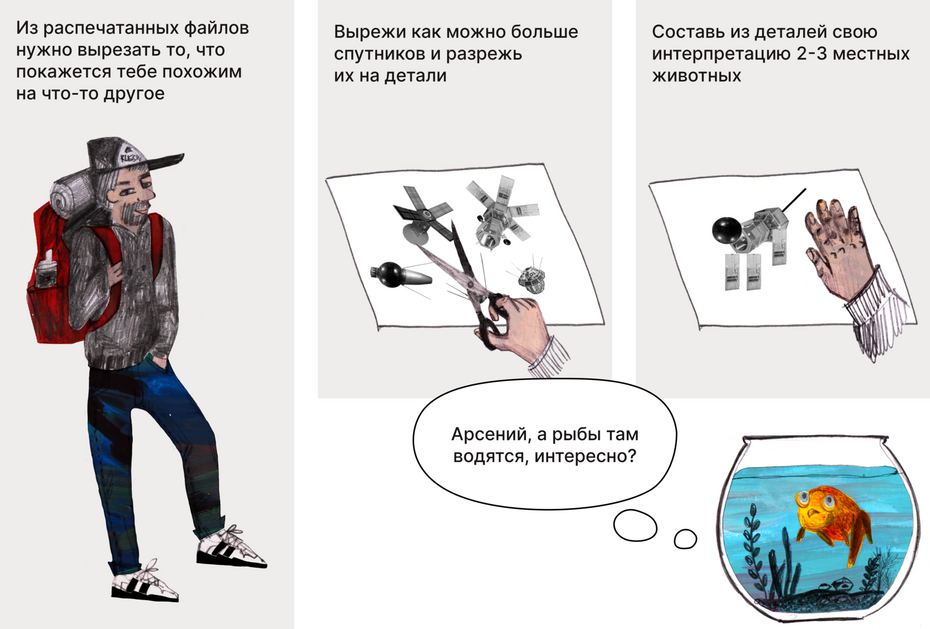 Давай пофантазируем и представим, что это не спутники Земли, а металлические птицы, которые кружат вокруг другой планеты. Основываясь на том как выглядят эти птицы, предложи свою интерпретацию других животных обитающих на этой планете