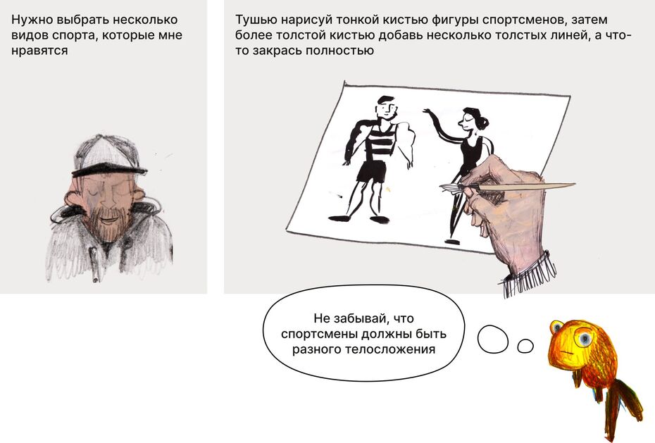 Тушью нарисуй несколько спортсменов с разными фигурами.