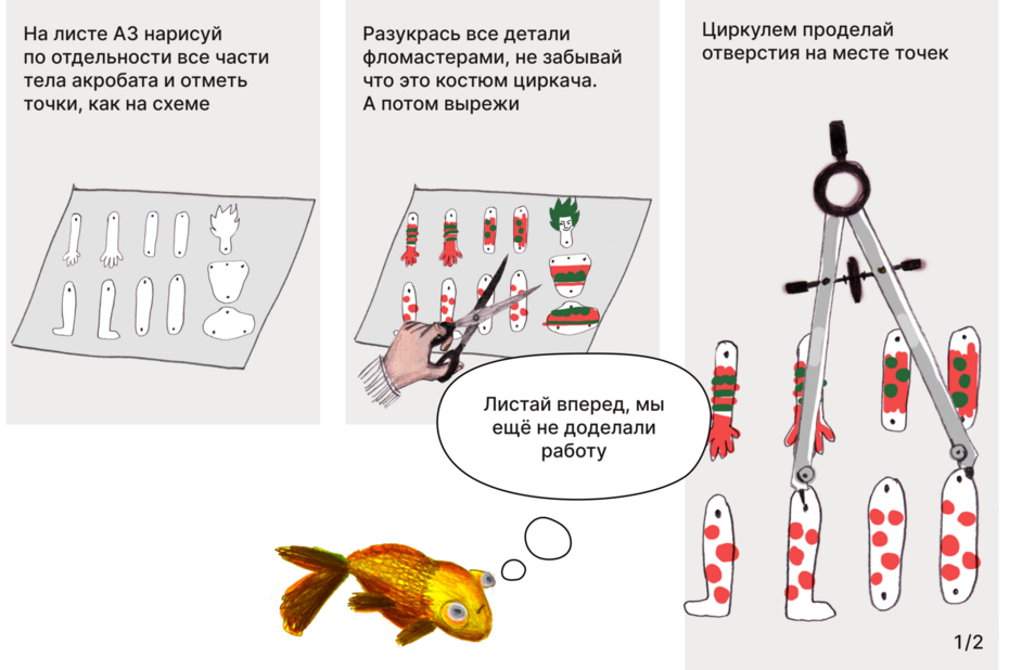 Создать акробата из бумаги на шарнирах.