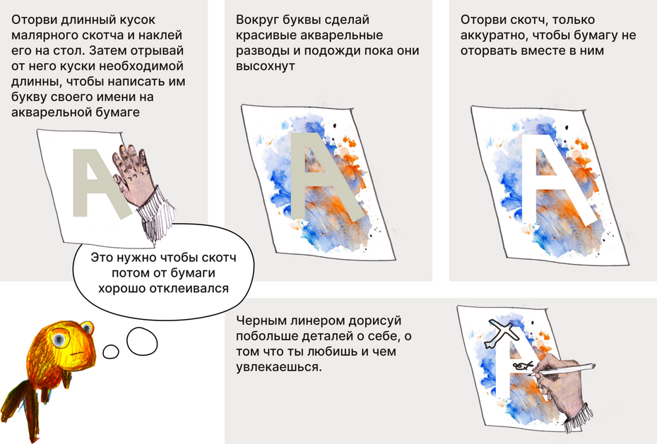 Сделать первую букву своего имени в технике трафарет, а затем линером добавить ей деталей, которые расскажут о тебе.