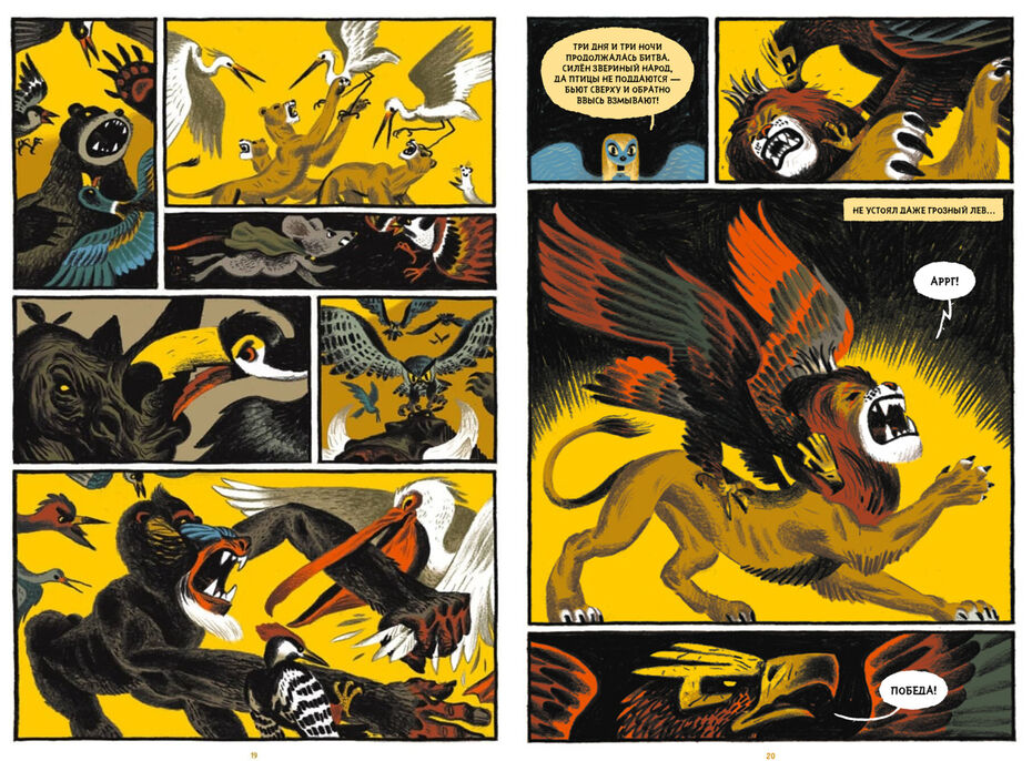 Переходя от картинки к картинке, мы наблюдаем за тем, что происходит с персонажами. Обрати внимание на то, как художник-иллюстратор использует цвет. В каждой картинке количество цветов минимально.