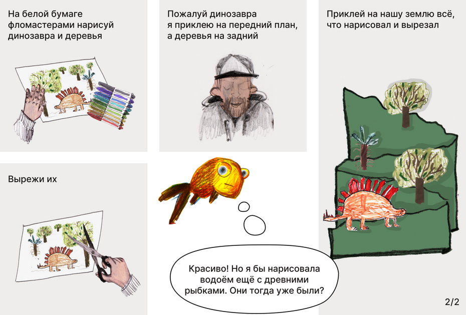 Наше путешествие во времени мы начнём с далёкого прошлого — времён динозавров — и узнаем, как можно изобразить пространство с помощью плановости в объёме.