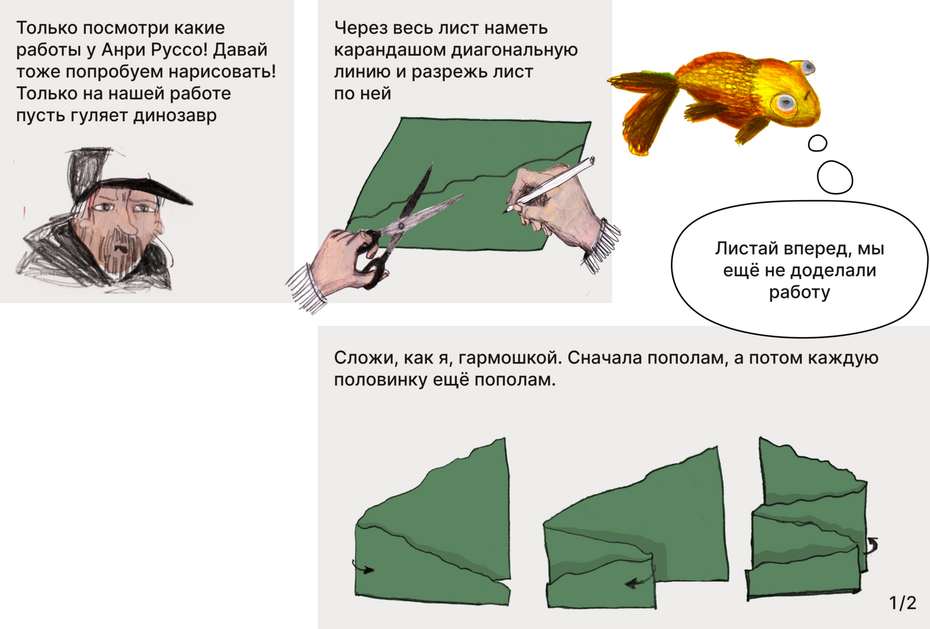 В нашей сегодняшней работе большую роль будет играть пространство вокруг динозавра. Чтобы изобразить этот мир, мы посмотрим на работы Анри Руссо. Он не рисовал динозавров, но его пейзажи с необычными растениями, крупными листьями и фантастическими цветами выглядят очень сказочно.