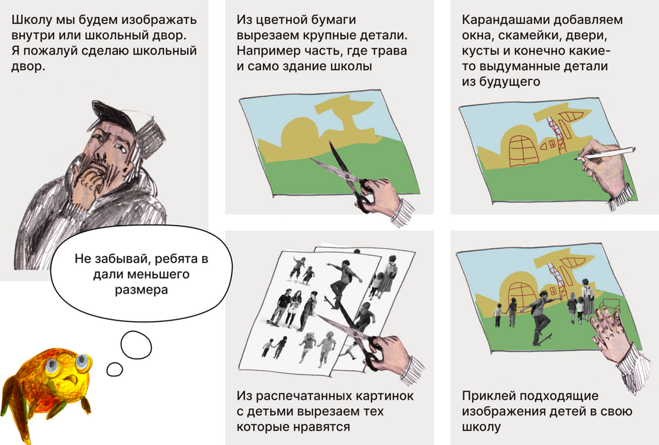 На этом занятии мы создадим архитектурный коллаж. С тем, что такое коллаж, мы уже знакомы — мы делали работы в этой технике. Но теперь, изучая пространство, познакомимся именно с архитектурным коллажом и придумаем школу будущего.