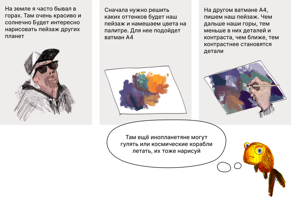 Сегодня поговорим о воздушной перспективе, отправимся на другие планеты и нарисуем там горный пейзаж. Тема нашего модуля — путешествия во времени. Поэтому мы перенесёмся в далёкое будущее, когда человечество научится с лёгкостью летать на другие планеты.