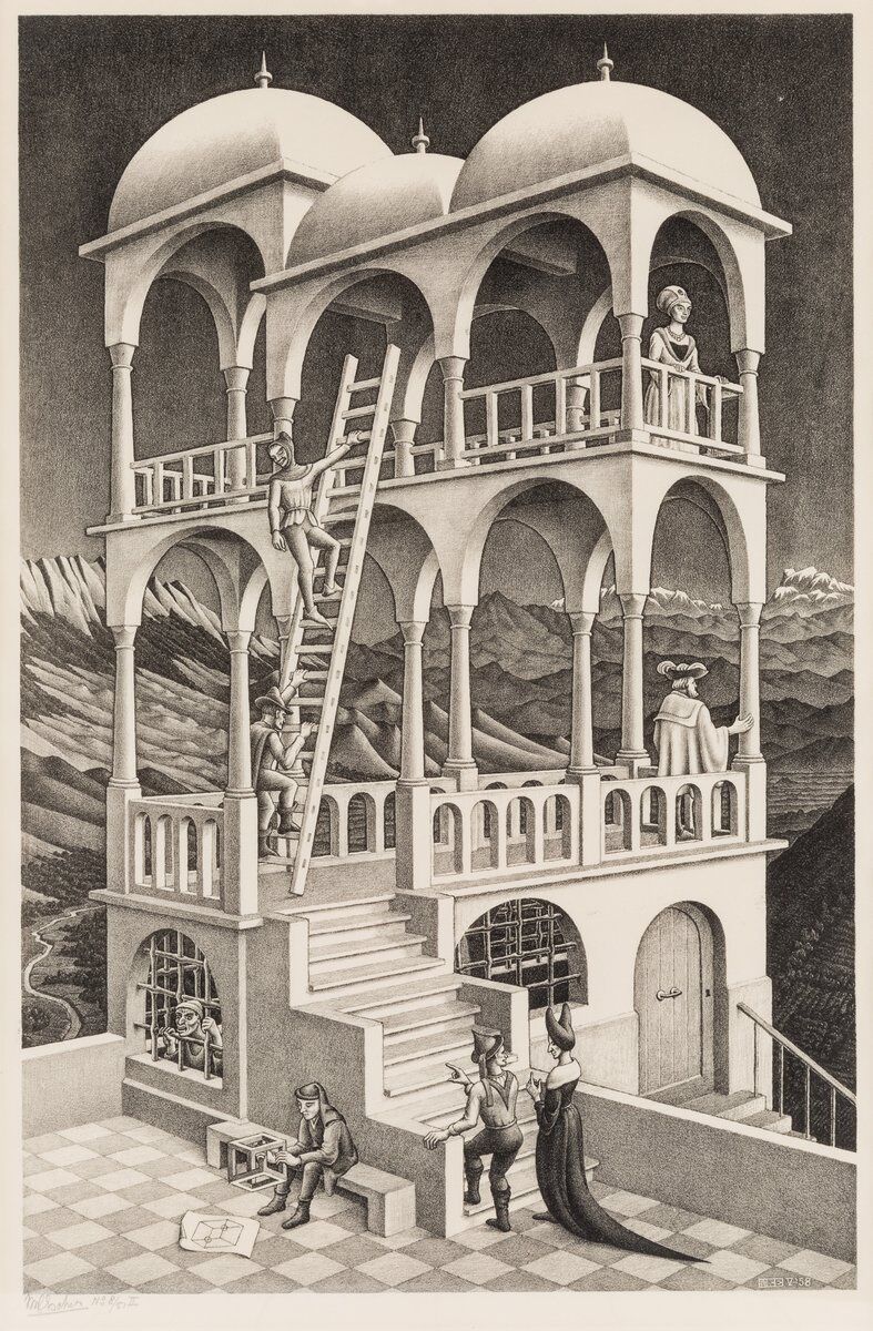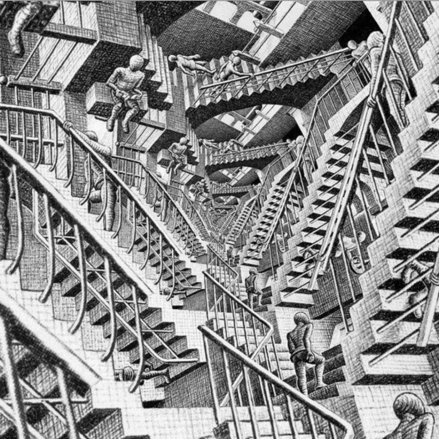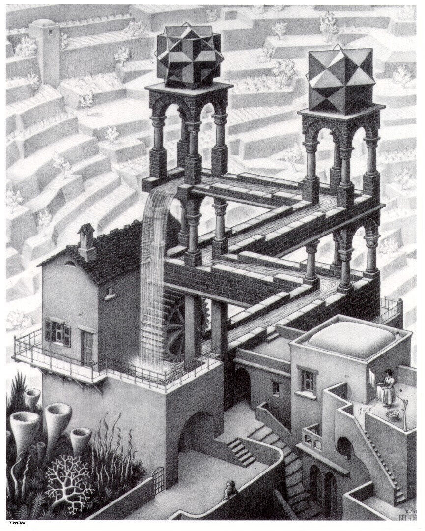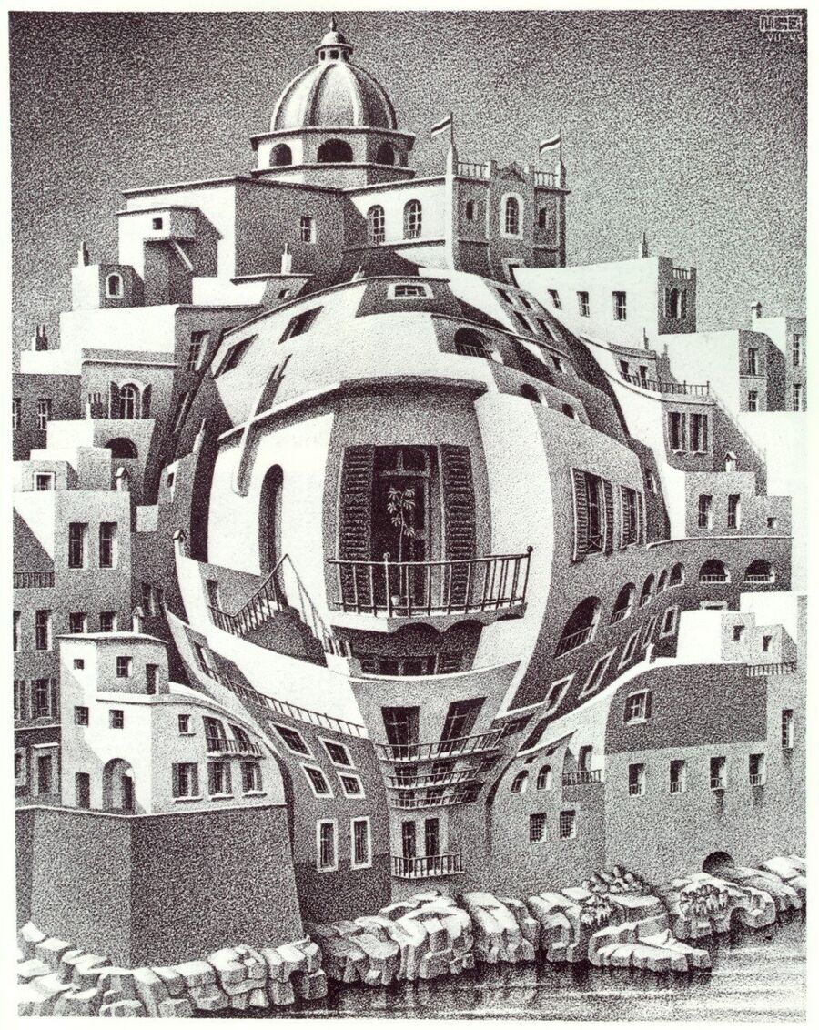 Чтобы разобраться, давайте посмотрим на работы Маурица Эшера. В его работах пространство искажается по-разному: верх может превращаться в низ, части зданий как будто выгибаются, люди ходят по стенам, а пол становится неровным и кривым.